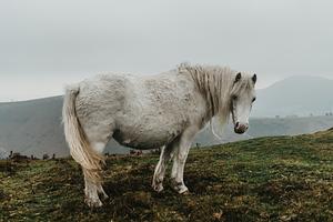 A white highland horse stands on a dark green meadow with misty hills beyond in the hills of Shropshire England. Photo by Ryan Brown of Lost Boy Memoirs and Visuals By Ryan.