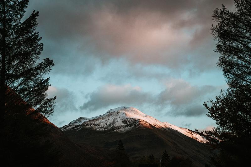 A snowcapped mountaintop painted with the colors of the setting and a dramatic and moody sky framed by silhouetted pines. Taken in Glen Nevis Scotland.